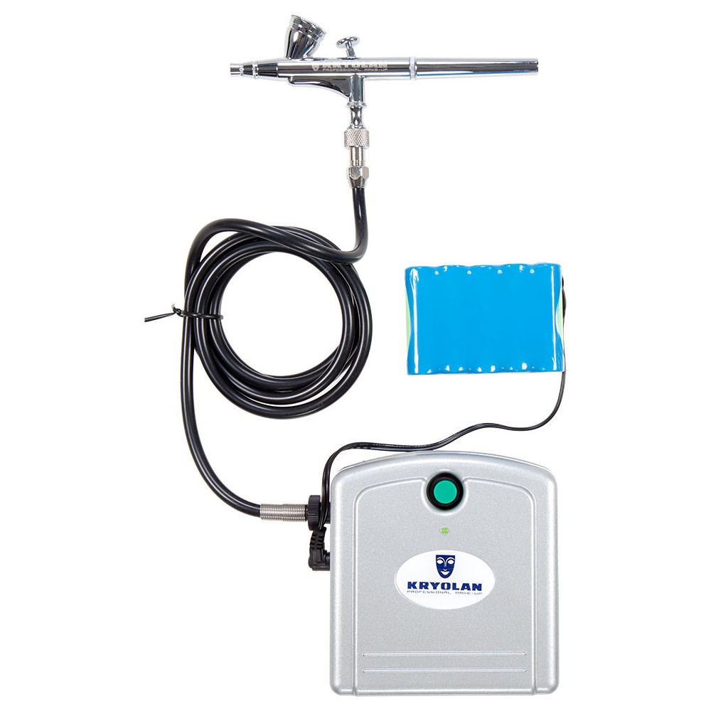 The Nebula Airbrush System Compressor Set was designed to apply the Kryolan professional Airbrush Make-up Nebula. This system operates with a gentle air-flow pressure of only 2.1 bar (appr. 30 psi). It is also exceptionally quiet in operation. For mobile work, the compressor can also be powered with the rechargeable battery pack that is included. The Nebula Airbrush Gun is a double action gun where the trigger controls both airflow and material. Other airbrush guns can also be connected to the compressor. This set includes the compressor, airbrush gun, battery pack and bag.